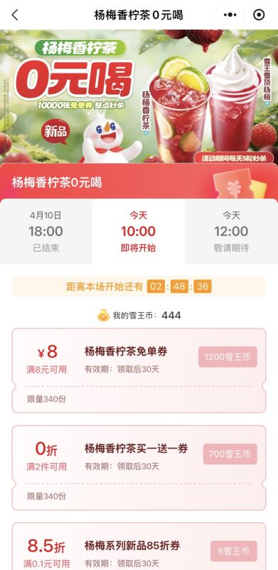 1200雪王币抢兑340份杨梅香柠茶免单 700雪王币抢兑340份杨梅香柠茶买1送1